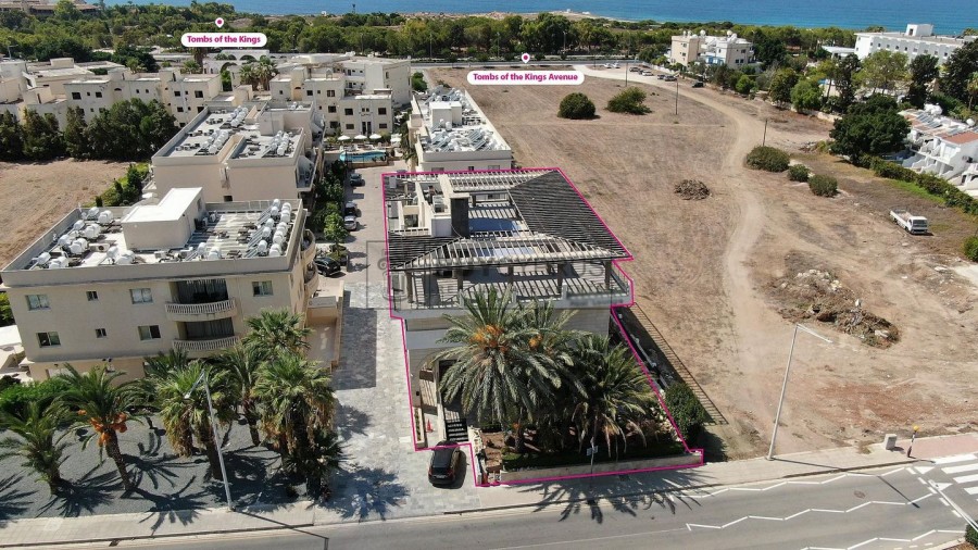 The property under consideration is a commercial building in Tomb Of The Kings Paphos. The share of sale is 20% which corresponds to Block 1 (commercial building), located on the north-eastern edge of the parcel.